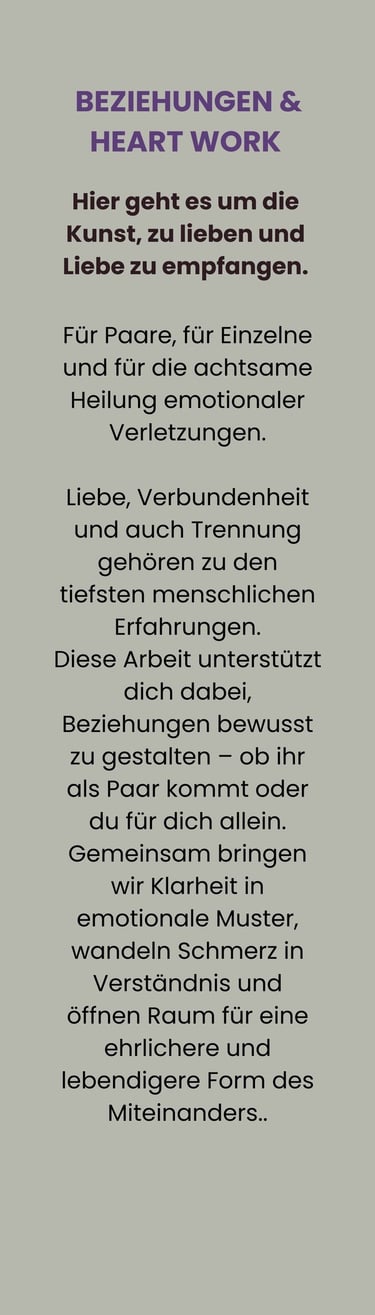Diese Arbeit unterstützt dich dabei, Beziehungen bewusst zu gestalten – ob ihr als Paar kommt oder du für dich allein.