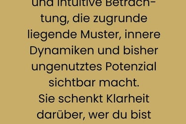 Auf Grundlage der Akasha-Chronik entsteht eine präzise und intuitive Betrachtung, die zugrunde liegende Muster, innere Dynamiken und bisher ungenutztes Potenzial sichtbar macht.
